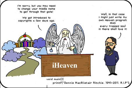 Sau khi viết bài tưởng niệm Steve Jobs trên Tia Sáng (http://tiasangold.codetot.org/Default.aspx?tabid=112&CategoryID=43&News=4520 ), tôi đã định không viết thêm bài về Dennis Ritchie nhưng khi tình cờ thấy được một bức biếm hoạ rất thú vị trên một trang mạng (mà tôi không biết ai là tác giả), trong đó “động chạm” đến cả hai thiên tài này thì tôi đã thay đổi ý kiến. Và tôi muốn dùng bức biếm hoạ nói trên để thay cho lời kết của bài viết. Tất cả những ai ngưỡng mộ và quan tâm đến các sự kiện liên quan đến Steve Jobs và Dennis Richie đều có thể dễ dàng giải mã được bức tranh thú vị và sâu sắc này.