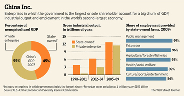 Hiện nay, các doanh nghiệp nhà nước đang chi phối lớn tới nền kinh tế Trung Quốc trên các lĩnh vực năng lượng, khai thác tài nguyên thiên nhiên, viễn thông, và hạ tầng. Bên cạnh những đặc quyền khác, họ được tận dụng nguồn vay ưu đãi từ các ngân hàng của nhà nước.