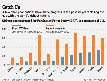 ![]() Một số nước nghèo trước đây đã tích cực tăng trưởng trong 40 năm qua để dần bắt kịp các nước phát triển. Bảng GDP trên đầu người các nước được điều chỉnh theo sức mua (PPP) tính theo % so với Mỹ (màu xanh: trung bình từ 1950-1969; màu cam: trung bình 2007-2009). |