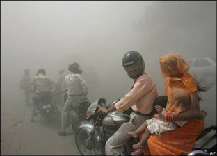 ![]() Tro than từ một nhà máy nhiệt điện che phủ đường phố Delhi, Ấn Độ |
