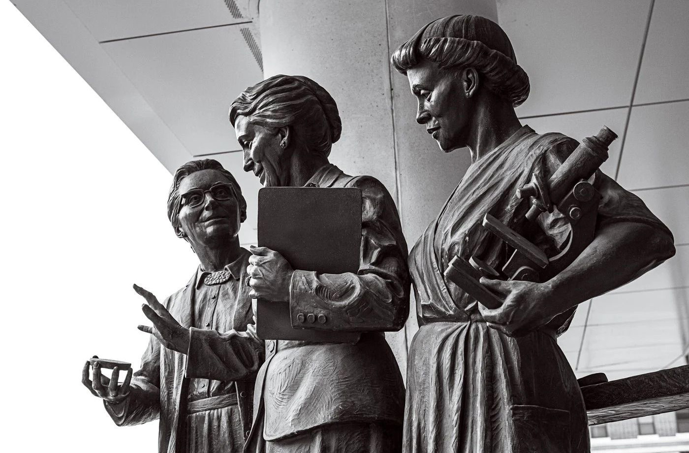 Bức tượng Kendrick đứng giữa, bên trái là Grace Eldering, bên phải trợ lý phòng thí nghiệm Loney Clinton với kính hiển vi trên tay.