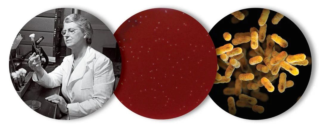 Pearl Kendrick đang làm việc. (Ảnh giữa và bên phải), một đĩa cấy khuẩn chưa môi trường thạch máu, và hình ảnh vi khuẩn Bordetella pertussis, thủ phạm gây ra bệnh ho gà. Chúng lây lan thông qua các giọt bắn trong không khí và xâm chiếm các tế bào phổi. Chúng chỉ có một vật chủ duy nhất: con người.