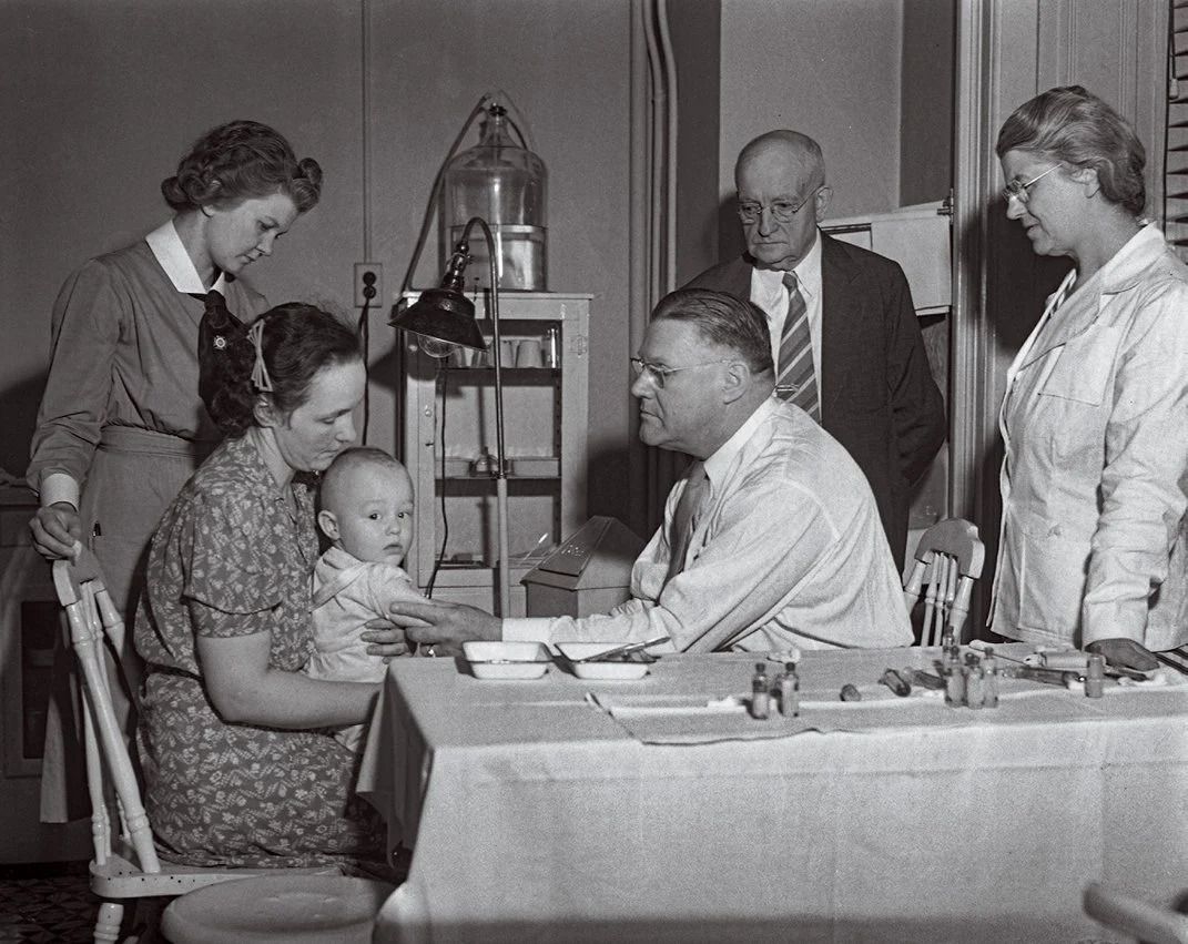 Kendrick, ngoài cùng bên phải, đang quan sát đồng nghiệp tiêm vaccine ho gà cho một em bé, năm 1942. Ngành y tế bắt đầu phân phối vaccine của bà từ năm 1940, đã giúp giảm số ca tử vong một cách thần kỳ.