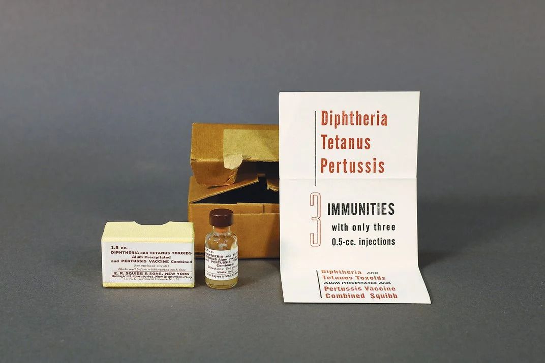 Bộ kit chứa một phiên bản đời đầu của vaccine Bạch hầu – Ho gà – Uốn ván DTP những năm 1940, kèm theo tờ rơi giới thiệu lợi ích từ việc giảm thiểu số mũi tiêm cần thiết.