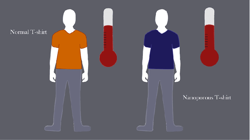 Các nhà nghiên cứu đã sử dụng nanoporous polyethylene (nanoPE), một chất liệu nhựa dẻo sẵn có với các vi lỗ có đường kính từ 50 đến 1.000 nanomet hay được dùng trong pin nhiên liệu để ngăn sự phóng điện. Trong những cuộc thử nghiệm, các nhà nghiên cứu đã tìm ra cách giải phóng sóng hồng ngoại qua vi lỗ của nanoPE với kết quả đạt 96%, trong khi tỉ lệ này ở vải bông chỉ là 1,5%. Nếu được dệt thành quần áo, chất liệu nanoPE này có thể khiến cho người mặc cảm thấy mát hơn 4 độ F so với mặc quần áo làm từ sợi bông.