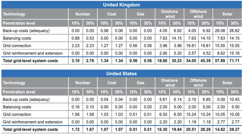 Ngày nay, trong các quốc gia, nơi các công nghệ có khả năng điều phối này có mặt, các chi phí này đều bằng không nhưng việc đưa năng lượng tái tạo vào hệ thống điện quốc gia khiến chi phí tăng đáng kể. Việc tích hợp các nguồn năng lượng tái tạo là một vấn đề phức tạp ảnh hưởng đến cấu trúc, tài chính, phương thức vận hành của các hệ thống điện. Trong phần lớn các quốc gia OECD, điện gió và điện mặt trời được trợ giá cho mỗi MWh tạo ra vào hệ thống điện bất chấp các mức giá thị trường. Khi nói ra điều này, chúng ta không muốn làm xói mòn vai trò của năng lượng tái tạo mà chỉ nhấn mạnh vào sự thật là không có sự đóng góp của điện hạt nhân, việc chuyển giao năng lượng sẽ trở nên chậm hơn, đắt đỏ hơn và rủi ro cao hơn. Việc làm cho các chi phí hệ thống này trở nên minh bạch có ý nghĩa quan trọng với các nhà đầu tư, khách hàng, các nhà hoạch định chính sách.