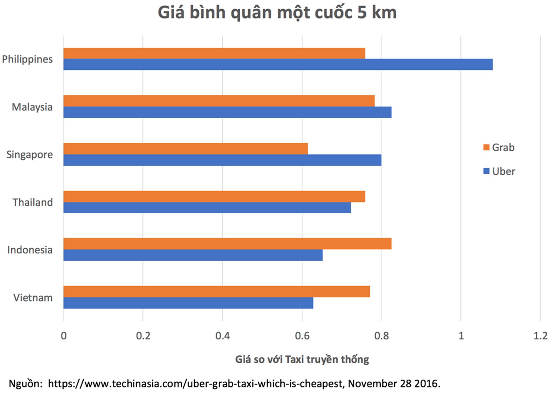 Tính tại thời điểm cuối năm 2016, ở các nước Đông Nam Á giá bình quân một cuốc năm cây số trên xe Uber và Grab thấp hơn taxi truyền thống từ gần 20% đến 40%. Tại Việt Nam, giá Uber thấp hơn taxi truyền thống 1/3 và Grab thấp hơn 1/4 (xem Hình 1). Giá Uber và Grab còn thấp hơn nữa cho cuốc dài hơn. Nếu hai công ty này ngưng hoạt động, giá xe cho người tiêu dùng có thể tăng còn cao hơn mức chênh lệch 25-33% vì giá taxi truyền thống có khả năng tăng nữa khi không còn áp lực cạnh tranh. Chính sách tạo rào cản với Uber/Grab dù thực hiện ở quốc gia nào thì luôn làm tăng chi phí cho người tiêu dùng. Nhưng riêng với Việt Nam, chi phí này khá nặng nề so với những thành phố ở các nước phát triển do các thành phố Việt Nam không có nhiều phương tiện di chuyển tốt thay thế – người dân London có xe Tube, Paris có Metro, New York có Subway. Hơn nữa, mức thu nhập đầu người ở Việt Nam chỉ khoảng 1/20 so với ở các nước phát triển nên chi phí đi lại chiếm phần tương đối lớn trong ngân sách cá nhân. Vì thế, sự gia tăng giá đi xe sẽ làm giảm phần thu nhập còn lại để mua sắm và giảm tiêu thụ cho những ngành khác.