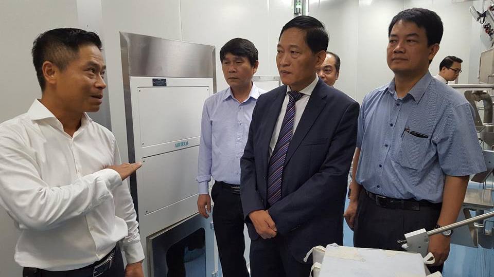 Thứ trưởng Bộ KH&CN Trần Văn Tùng (thứ hai từ phải sang) và TS. Trần Chí Thành, Viện trưởng VINATOM (ngoài cùng), TS. Hoàng Anh Tuấn , Cục trưởng Cục Năng lượng Nguyên tử (thứ hai từ trái sang) nghe cán bộ VINAGAMMA giới thiệu về dịch vụ chiếu xạ của Trung tâm. Ảnh: Kiều Anh.