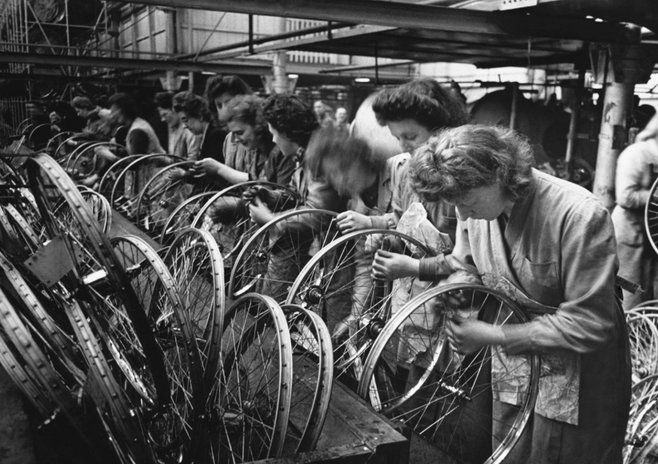 Nữ công nhân chế tạo bánh xe đạp tại nhà máy Hercules Cycle ở Birmingham, Anh vào những năm 1940. Được thành lập vào năm 1910, tới những năm 1930 Hercules là một trong những nhà sản xuất xe đạp lớn nhất thế giới, chế tạo ra hơn 1.000 chiếc xe đạp mỗi ngày.