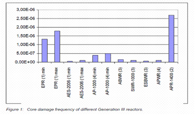 ![]() Tần suất hư hỏng lõi lò (Core damage frequency) của các lò thuộc thế hệ III/III+. Có thể thấy lò VVER1200 (AES-2006) của Liên bang Nga có tần suất hư hỏng vào loại thấp nhất, nhỏ hơn nhiều so với 5×10-7/năm hoạt động của lò phản ứng hay 1 triệu năm hoạt động của lò phản ứng mới có 1 lần hỏng hóc. |