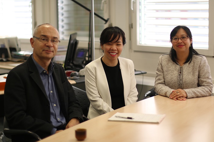 Từ phải qua: Chị Nguyễn Thụy Phương, Nguyễn Thúy Uyên Phương Phỏng vấn GS Pascal Zesiger – Hiệu trưởng trường Tâm lý giáo dục, ĐH Geneva. Ảnh: NVCC.