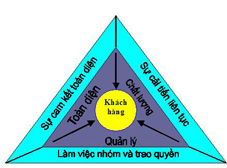 Người ta nói rằng, Hệ thống tiêu chuẩn chất lượng ISO 9000:2000 là một hình thức quản lý chất lượng bằng văn bản theo tư tưởng TQM. Không biết có đúng không, nhưng những ai đã làm chất lượng, dù ở bất kỳ lĩnh vực nào, đều công nhận, TQM hiện nay vẫn là triết lý quản lý chất lượng phổ biến và hiện đại nhất. Bản chất của TQM cũng rất đơn giản, gói gọn trong tám chữ: Khách hàng – Quản lý – Chất lượng – Toàn diện. Muốn làm chất lượng thì khách hàng phải thực sự là trung tâm. Mọi hoạt động đều phải hướng tới cái đích cuối cùng là thỏa mãn nhu cầu của khách hàng (cần lưu ý, nhu cầu ở cả hai dạng: đã có hoặc tiềm ẩn). Nguyên tắc quản lý cơ bản là dựa trên lòng tin, tin và mạnh dạn trao quyền cho các nhóm chất lượng cũng như từng thành viên. Chất lượng sẽ được đảm bảo nhờ quá trình cải tiến liên tục. Và cuối cùng, làm chất lượng sẽ không có kết quả nếu không có sự tham gia toàn diện của tất cả mọi người, ở tất cả mọi công đoạn xuyên suốt quá trình (xem Hình 1).