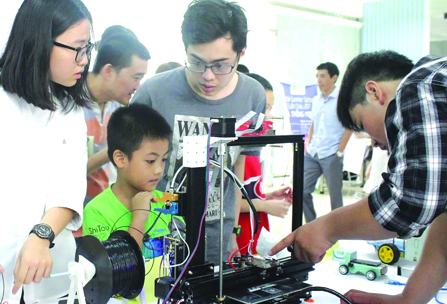 Các em học sinh tiểu học đang tham quan gian hàng trình diễn in 3D trong ngày hội STEM do Tia Sáng và Liên minh STEM tổ chức, năm 2017. Ảnh: BN.