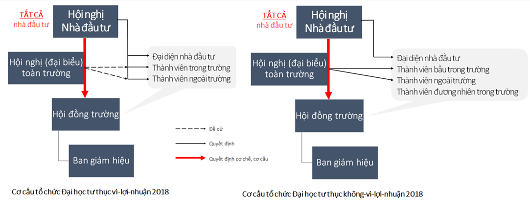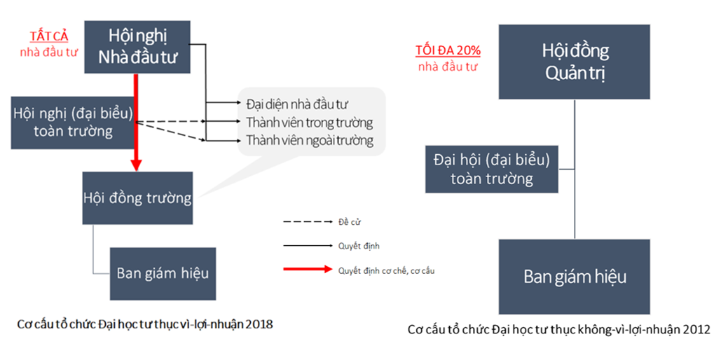 Thật ra, mô hình đại học tư thục không vì lợi nhuận theo luật Giáo dục Đại học 2018 là một bước lùi so với luật Giáo dục Đại học 2012. Theo Điều lệ Đại học 2014 (ban hành dựa trên luật Giáo dục Đại học 2012), Hội đồng quản trị là tổ chức có quyền lực cao nhất trong mô hình đại học tư thục không vì lợi nhuận: Hội nghị cổ đông/nhà đầu tư không tồn tại; mặc dù có tồn tại Đại hội toàn trường, nhưng Đại hội này chủ yếu là đóng góp chiến lược phát triển của trường, chứ không có quyền ảnh hưởng đến cơ cấu và thành phần của Hội đồng quản trị. Ngoài ra, Điều lệ Đại học 2014 cũng khống chế tỉ lệ các nhà đầu tư trong Hội đồng trường ở mức 20%. Đây là một quy định cốt lõi khiến cho Hội đồng trường có thể đưa ra được những quyết định tương đối độc lập với quyền lợi của các thành viên góp vốn. Nói cách khác, trong trường hợp này, nguyên tắc không xung đột lợi ích dễ được đảm bảo hơn.