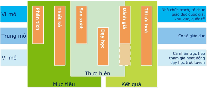– vi mô (micro): liên quan đến các cá nhân trực tiếp tham gia hoạt động giáo dục như học sinh sinh viên, giáo viên, trợ giảng, nhân viên hỗ trợ, chuyên gia đánh giá, v.v., với các yếu tố hành động cụ thể như môn học trực tuyến, giáo dục trực tuyến mở đại trà (MOOC), tài nguyên giáo dục mở (OER), kế hoạch học tập, đơn vị hay module học tập…