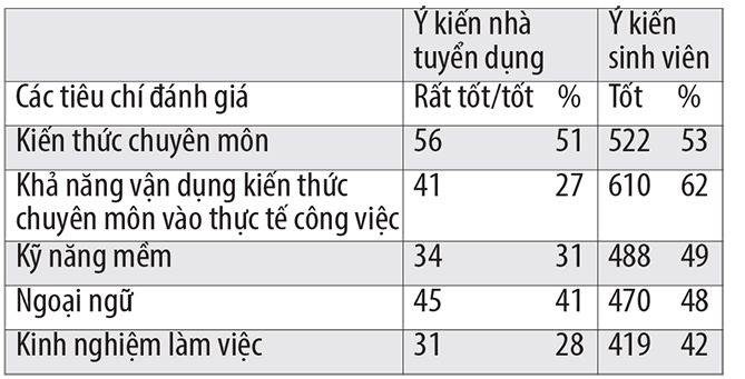 Bảng 1: So sánh quan điểm của doanh nghiệp và sinh viên về hành trang của sinh viên khi lập nghiệp (Khảo sát này được tiến hành với sự hỗ trợ từ 109 nhà tuyển dụng và 988 sinh viên, tháng 2/2015).