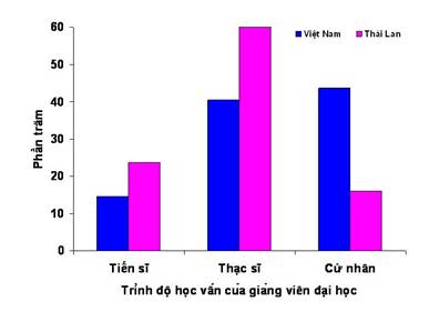 Về trình độ học vấn của giảng viên, có sự khác biệt khá lớn giữa hai nước. Trong số 38.217 giảng viên đại học ở Việt Nam, khoảng 15% có bằng tiến sĩ, 40% thạc sĩ, và 44% cử nhân. Ở Thái Lan, trong số 59.562 giảng viên, số có bằng tiến sĩ là 24%, thạc sĩ 60%, và cử nhân 16% (Biểu đồ 1).