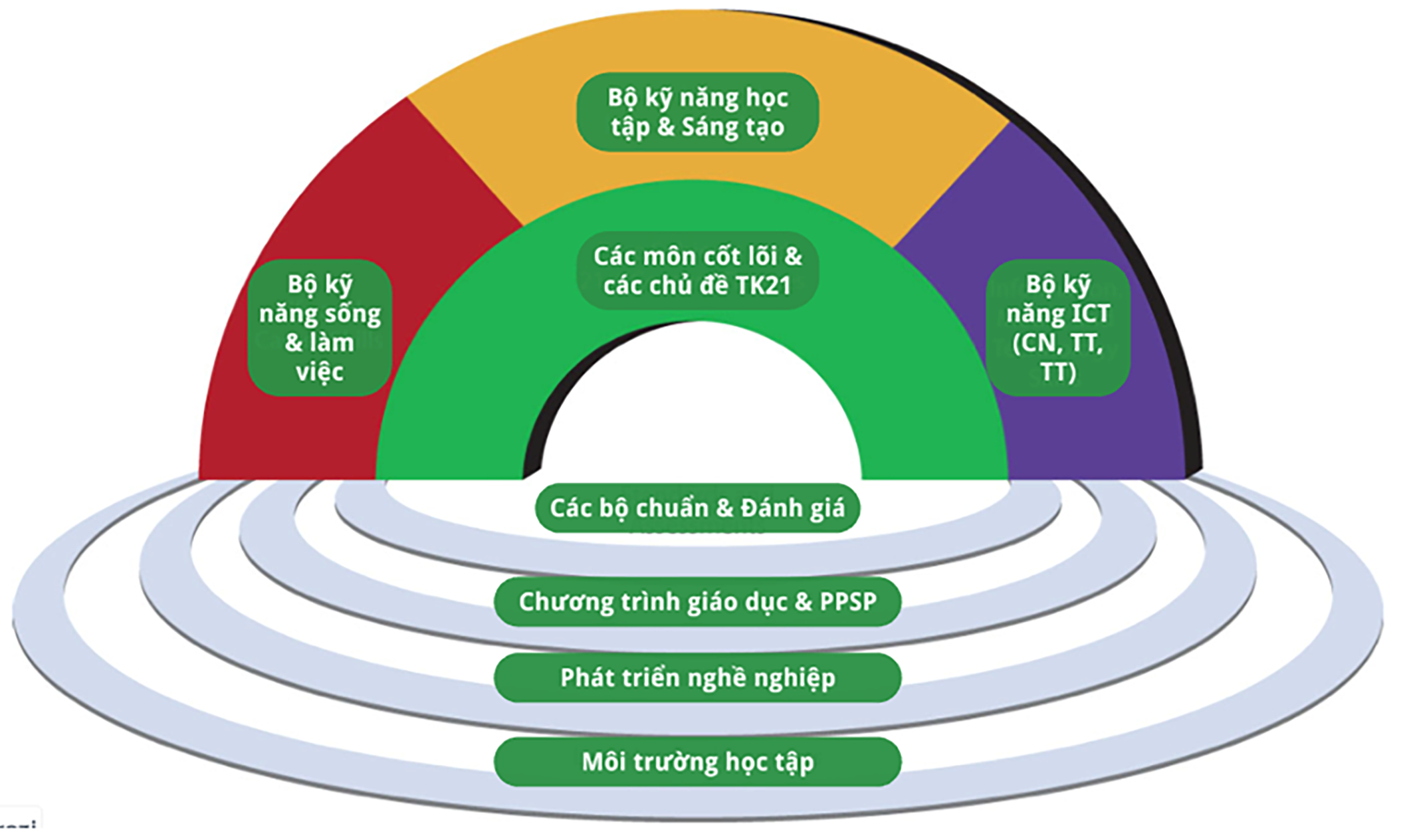 Ngoài kiến thức chuyên ngành, còn cần trang bị khối kiến thức chung mà bất cứ công dân nào của thế kỷ 21 cần phải có. Tổ chức ‘Partnership for 21st Century skills’3 gọi tắt là P21 đã khảo sát, xây dựng và ban hành Khung Kỹ năng thế kỷ 21 (Hình 1), trong đó nêu rõ khối kiến thức chung bao gồm các môn cốt lõi và các chủ đề liên ngành. Đây là sự bắt tay giữa các tổ chức giáo dục với khối doanh nghiệp để đặt ra các yêu cầu, tiêu chuẩn đối với nguồn nhân lực nhằm thu hẹp khoảng cách về kỹ năng, năng lực của sinh viên tốt nghiệp khi bước vào thị trường lao động.