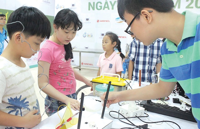 Các em học sinh làm thí nghiệm khoa học trong ngày hội STEM 2018. Ảnh: Bảo Như.