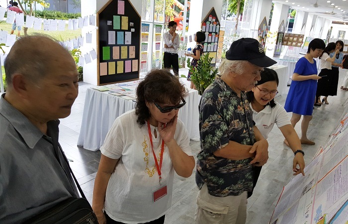Nhà giáo Phạm Toàn và khách tham quan triển lãm.