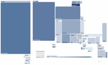 viii Sản phẩm của tri thức khoa học và các ấn phẩm công bố khoa học có một bản đồ địa lý rất phân biệt. Bản đồ này dùng dữ liệu trích xuất từ Web of Knowledge Journal Citation Reports (JCR) từ 2009, cho phép chúng ta đo lường địa điểm và chỉ số tác động của mỗi tập san. JCR Science Edition chứ tư liệu của trên 7,300 tập san về khoa học và công nghệ. JCR Social Sciences chứa tư liệu của 2,200 tập san trong khoa học xã hội. Tư liệu của mỗi tập san trong số 9,500 tập san về khoa học tự nhiên và khoa học xã hội đã được tải về để phân tích vị trí địa lý của tập san. Một biểu đồ diện tích được dùng cho mỗi nướcm, đại diện cho số lượng tập san được xuất bản trong nước đó. Độ đậm nhạt của mỗi nước phản ánh chỉ số tác động trung bình (một chỉ số phản ánh mức độ được trích dẫn ít hay nhiều của các tập san trong nước đó.