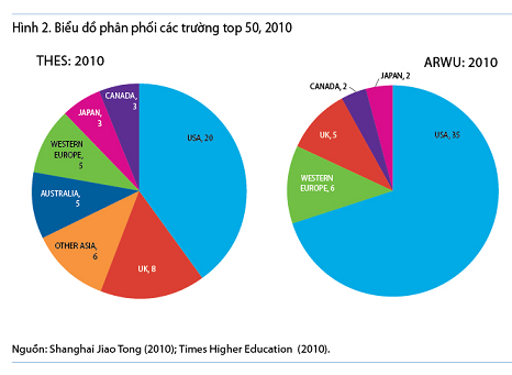 Kết quả xếp hạng giúp sinh viên, gia đình họ và các nhà tuyển dụng thấy được kết quả của từng trường riêng lẻ; tuy nhiên, không nói lên điều gì đáng kể về chất lượng hoạt động tổng thể của hệ thống GDDĐH một nước. Chẳng hạn, các bảng xếp hạng không đo lường kết quả của một hệ thống về mặt đem lại cơ hội bình đẳng trong việc tiếp cận giáo dục, về chất lượng và tính thiết yếu cho xã hội, về sự phân tầng hệ thống (hay nói cách khác, sự đa dạng về sứ mạng của các trường – ND), và những đóng góp cho sự phát triển xã hội và kinh tế địa phương thông qua đào tạo một nguồn vốn con người có kỹ năng cao và tạo ra các sáng chế. Theo các bảng xếp hạng toàn cầu, những trường tốt nhất trên thế giới chủ yếu nằm ở Hoa Kỳ, như trong Hình 2, phân tích 50 trường hàng đầu trong hai bảng xếp hạng THE và ARWU. Trong THE, 40% là các trường Hoa Kỳ, còn trong ARWU, 70% trong 50 trường tốt nhất là các trường nằm tại Hoa Kỳ.