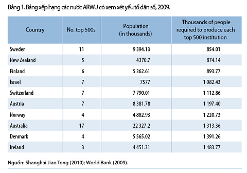 Thật đáng ngạc nhiên, Nhật Bản là quốc gia châu Á duy nhất có mặt trong bảng xếp hạng ARWU, trong khi 6 trường ĐH Châu Á khác bên cạnh Nhật Bản lại có mặt trong bảng xếp hạng THE, và những nước hay vùng lãnh thổ này, vốn được gọi là “con cọp châu Á” (Hong Kong, Singapore, South Korea, Taiwan) thường được xem là những nền kinh tế năng động bậc nhất trên thế giới. Thêm nữa, nếu tính số trường “đẳng cấp thế giới” trong tương quan với dân số của quốc gia, sẽ thấy rằng một số nền kinh tế năng động đang đạt được những kết quả rất tốt dù họ không có nhiều trường trong top 500 trên thế giới, như Bảng 1 dưới đây. Bảng này cũng cho thấy một số nước có hiệu quả hơn so với nước khác trong việc tạo ra những trường lọt top 500. Ví dụ, Phần Lan, New Zealand và Thụy Điển có số trường được lọt vào bảng xếp hạng tính bình quân trên số dân cao hơn so với các nước khác.