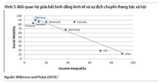 Tương tự, các bảng xếp hạng rất ít lưu ý đến hiệu quả của hệ thống GDĐH các nước trong việc phục vụ xã hội như một bậc thang giúp thoát khỏi đói nghèo. Như ta thấy trong Hình 3 dưới đây, những nước như Hoa Kỳ và UK, vốn có số trường được xếp hạng hàng đầu vào loại cao nhất, lại là những nước chẳng đạt được thành tích đáng kể xét về mặt tạo ra dịch chuyển trong thang bậc xã hội.