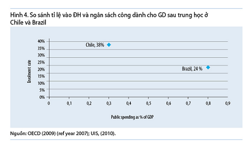 Để chỉ ra một ví dụ về đối sánh trong hành động, ta có thể so sánh kết quả hoạt động của Chi lê và Brazil. Nếu mục đích là có số người vào ĐH cao nhất có thể, thì Chile có thể được xem là hiệu quả hơn so với Brazil bởi họ sử dụng ít nguồn lực hơn để đạt được cùng một mục tiêu. Như minh họa trong Hình 4, Chile sử dụng 0,3% GDP và có tỉ lệ 38% vào ĐH, trong lúc Brazil tiêu tốn 0,9 % và có 24% người vào ĐH. Điều này đặt ra câu hỏi: tại sao Chile có hiệu quả hơn và Brazil có thể học gì từ ví dụ của Chile.