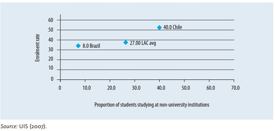 Sự khác biệt về sứ mạng của các trường là một tiêu chí quan trọng đánh giá sức khỏe của hệ thống. Tiêu chí này đo lường số lượng sinh viên trong các trường sau trung học, nhưng không phải là đại học chẳng hạn như các trường cao đẳng cộng đồng, các cơ sở đào tạo mở và từ xa, v.v. Hình 11 cho thấy 11% người học ở bậc sau trung học của Chile hiện đang học trong những cơ sở không phải là ĐH như thế, trong lúc con số này ở Brazil là ít hơn 10%. Người ta có thể suy đoán rằng đó có thể là lý do khiến tỉ lệ người học sau trung học ở Chile cao hơn, vì Chile đem lại nhiều cơ hội đa dạng hơn cho người học, nhiều loại trường khác nhau sẵn có hơn là so với Brazil.