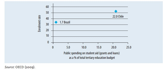 Cuối cùng, Hình 12 nhấn mạnh rằng có sự khác biệt nổi bật trong việc tiếp cận các nguồn hỗ trợ tài chính cho sinh viên để học có thể theo đuổi giáo dục bậc cao. Chính phủ Chile phân bổ 12% ngân sách công dành cho GDĐH vào việc hỗ trợ sinh viên bao gồm cả tài trợ và cho vay, trong lúc chính phủ Brazil cung cấp chỉ 2% cho mục tiêu này.