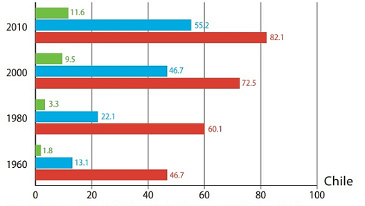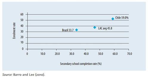 Để khởi đầu cho việc so sánh Chile và Brazil, điều quan trọng là trước hết phải đánh giá chất lượng hoạt động tương đối của họ thông qua tỉ lệ bằng cấp sau trung học đạt được trong dân số. Như có thể thấy trong Hình 6 và 7 miêu tả sự tăng trưởng trong số người có bằng ở cấp tiểu học, trung học, và đại học, Chile đạt được kết quả tốt hơn trong số người học trung học và sau trung học kể từ 1980. Năm 2010, Chile đạt được tỉ lệ 11,6% dân số trong độ tuổi 25-65 có bằng sau trung học, trong khi con số này ở Bazil là 5,6%.