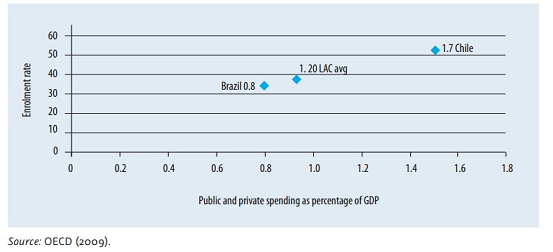 Hình 9 cho thấy mức độ đầu tư cho GDĐH của Chile so với Brazil. Kết quả của Chile là do Chile đã có thể huy động được một tỉ lệ lớn hơn nhiều nguồn vốn từ khu vực tư, thông qua cơ chế chia sẻ chi phí trong các trường công và qua sự mở rộng nhanh chóng khu vực tư trong GDĐH, trong lúc đó Brazil đã tiêu tốn ngân sách công nhiều hơn cho GDĐH. Nhìn chung, tổng nguồn đầu tư bao gồm cả công và tư cho GDĐH ở Chile là 1,8% GDP, trong lúc ở Brazil ít hơn một nửa, chỉ là 0,7% GDP.