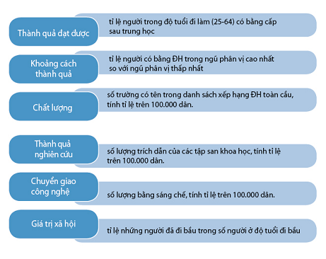 • Đầu vào: Nguồn lực đầu tư vào hệ thống GDĐH có mức độ như thế nào (chẳng hạn: mức tài trợ, số lượng và trình độ của đội ngũ khoa học, sự chuẩn bị cho sinh viên trước khi vào ĐH, chương trình đào tạo và hạ tầng cơ sở của việc học tập) để dẫn tới những kết quả tích cực?