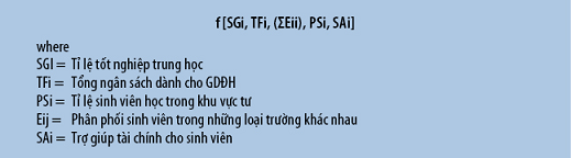• Tổng ngân sách cho GD sau trung học phản ánh mức độ cam kết của chính phủ đối với GD sau trung học, cũng như sự thành công trong việc huy động các nguồn lực tư (cơ chế chia sẻ chi phí, quyên tặng, thu nhập từ nghiên cứu, tư vấn và hợp đồng đào tạo, v.v.).