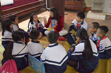 Học sinh tiểu học tìm hiểu về chủ đề “lớp học xưa” tại Văn Miếu Quốc Tử Giám. Ảnh: Vân Anh.