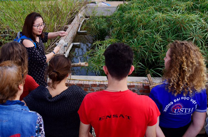 Sinh viên Việt Nam và Pháp đi thực tập khảo sát mô hình xử lý nước thải tại Gia Lâm. Ảnh: Tăng Thị Chính.