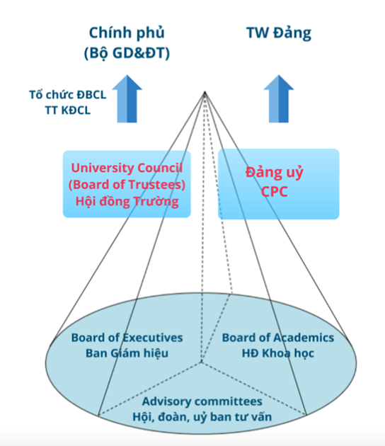 Mặc dù không có tài liệu nào nêu rõ mô hình quản trị đại học của Việt Nam, tuy nhiên từ các quy định, điều khoản trong Luật GDĐH sửa đổi 2018 và Luật GDĐH 2012 có thể phác họa như sau: