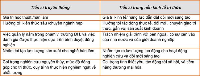 Quan niệm cực đoan như thế của trường phái “tháp ngà” ngày nay hầu như không còn chỗ đứng. Tuy nhiên, nó đã phản ánh một thực tại là trong nhiều thế kỷ qua, chỗ làm của các tiến sĩ chủ yếu là ở các trường ĐH và viện nghiên cứu. Ngày nay, kinh tế tri thức đòi hỏi một lực lượng lao động có kỹ năng cao trong việc nghiên cứu, đổi mới, sáng tạo, ứng dụng và chuyển giao tri thức. Dường như khu vực sản xuất kinh doanh bên ngoài nhà trường ngày càng cần những người được đào tạo kỹ năng nghiên cứu bậc cao như các tiến sĩ. Lối đào tạo tiến sĩ theo kiểu hàn lâm truyền thống đã không chú ý đến việc đào tạo những kỹ năng đa dạng và linh hoạt để đáp ứng những đòi hỏi của thế giới việc làm bên ngoài trường ĐH, thậm chí ngay cả những kỹ năng cơ bản để thực hiện nhiệm vụ truyền thống của các tiến sĩ như kỹ năng giảng dạy và hướng dẫn nghiên cứu, họ cũng không được đào tạo bài bản. Bởi vậy, đang có một khoảng cách giữa mô hình đào tạo tiến sĩ hiện nay và những gì các tiến sĩ có thể mang lại cho thế giới việc làm ngoài nhà trường.