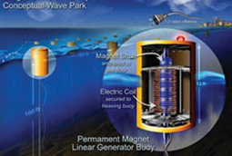 Đại dương chiếm hơn 70% bề mặt Trái đất. Trong đó sóng biển mang trong mình nó năng lượng dồi dào có thể làm các tua-bin hoạt động và biến năng lượng cơ học trên thành điện. Trở ngại khi dùng là việc khai thác nó vì đôi khi các con sóng quá nhỏ để sản xuất đủ năng lượng cần thiết. Do đó, yêu cầu đặt ra là phải có cách tích lũy khi năng lượng cơ học được sinh ra đủ.