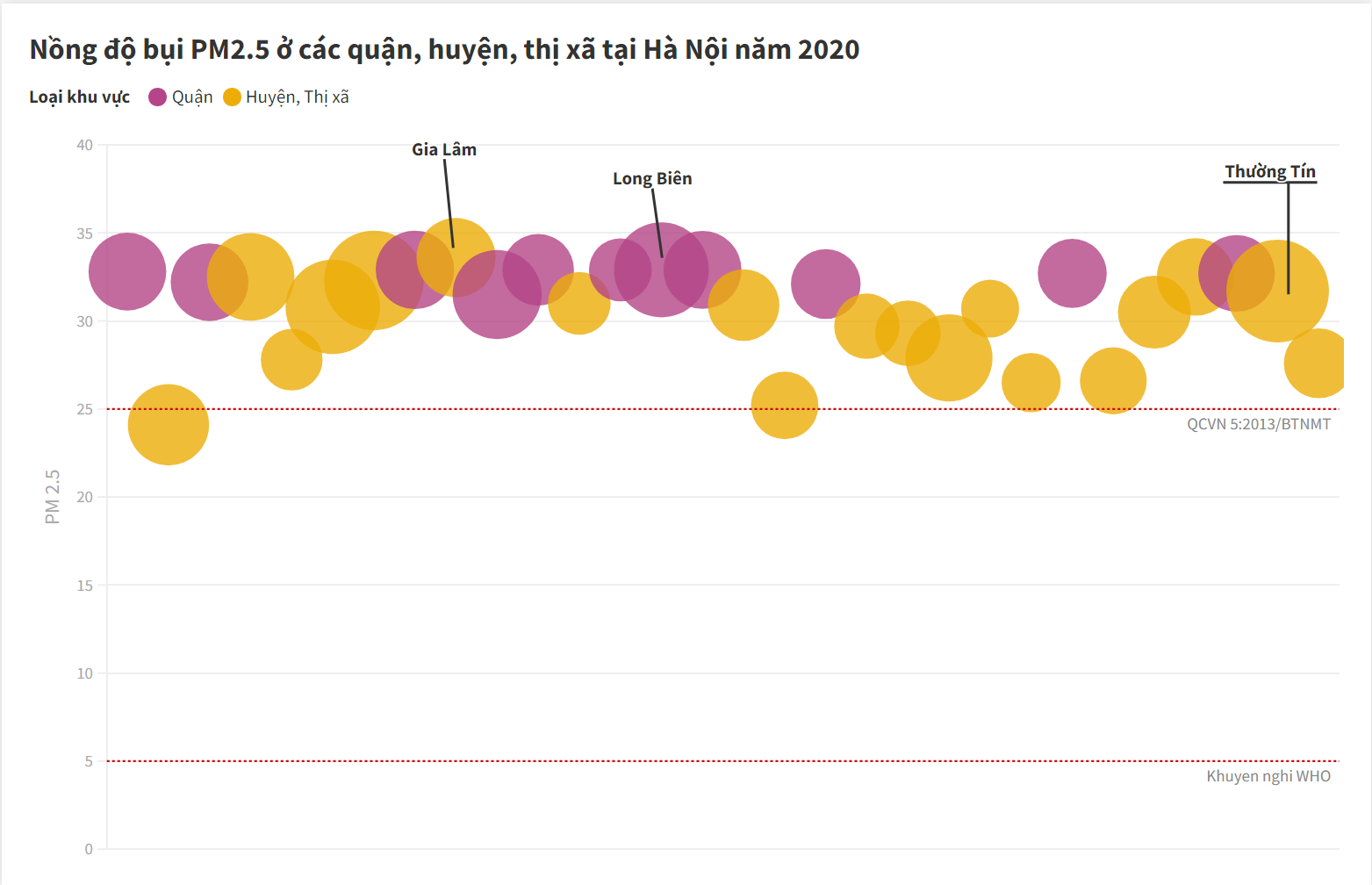 Ở Hà Nội, dễ thấy là khu vực ngoại thành có nồng độ bụi thấp hơn nội thành. Nhưng cũng có trường hợp đặc biệt như huyện Gia Lâm và Thường Tín là hai khu vực ngoại thành có nồng độ PM2.5 vượt trên tất cả các quận nội thành khác, trừ Long Biên.