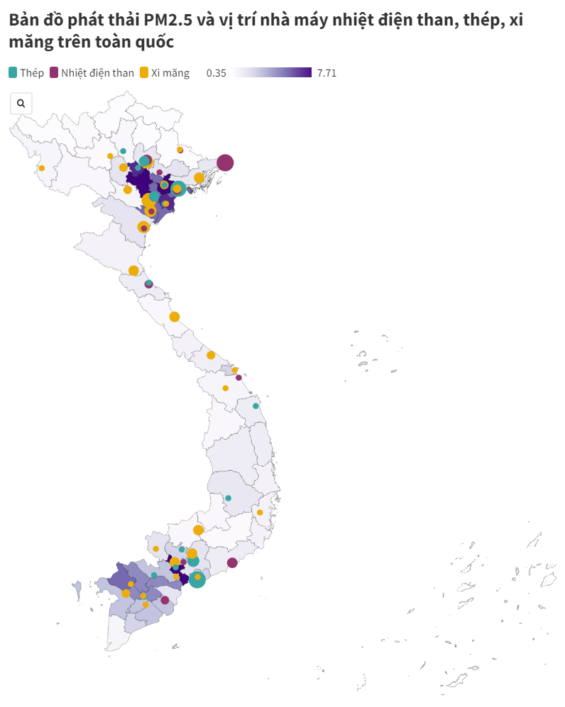 Bên cạnh bản đồ về hiện trạng PM2.5 toàn quốc dựa trên dữ liệu mô hình MEM, chúng tôi còn “sưu tập” được bản đồ phát thải PM2.5 đến từ nghiên cứu độc lập của GS.TS. Nguyễn Thị Kim Oanh và TS. Lại Nguyễn Huy của Học viện Công nghệ Thái Lan. Trên bản đồ phát thải này, chúng tôi chồng lên một lớp dữ liệu về vị trí của các nhà máy xi măng, thép và nhiệt điện than trên cả nước. Số liệu về vị trí và số lượng nhà máy được lấy từ thống kê của Mạng lưới không khí sạch Việt Nam – VCAP. Người xem có thể thấy các nhà máy tập trung dày đặc ở khu vực Đồng bằng sông Hồng. Tuy nhiên, điều thú vị (hay ngạc nhiên) là Quảng Ninh, nơi có nhiều nhà máy điện than nhất cả nước (tám nhà máy) và có ba nhà máy xi măng lại có nồng độ bụi PM2.5 trung bình năm thấp hơn QCVN 5:2013/BTNMT. Tỉnh này phát thải rất thấp so với các tỉnh lân cận, chỉ khoảng trên dưới 1.5 tấn PM2.5/km2/năm trong khi tỉnh giáp ranh là Hải Phòng phát thải gấp 3-4 lần như vậy (tỉnh này có 2 nhà máy nhiệt điện than, 7 nhà máy thép và 2 xi măng). Bắc Ninh tuy không có bất kì một nhà máy điện than, xi măng và thép nào nhưng có nồng độ bụi PM2.5 cao nhất toàn quốc và lượng phát thải PM2.5 cũng cao.