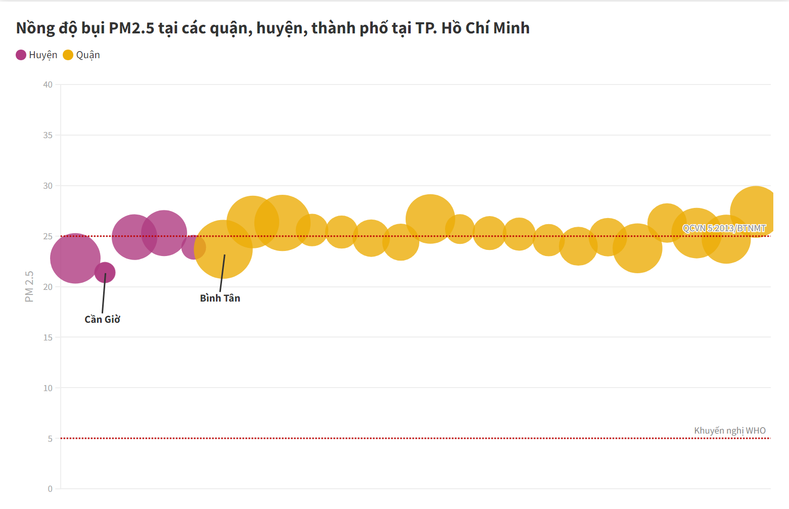 Theo bản đồ phát thải, thành phố Hồ Chí Minh là nơi phát thải PM2.5 lớn nhất cả nước, cùng với Hà Nội. Tuy nhiên, theo dữ liệu mô hình, nồng độ PM2.5 trung bình năm ở thành phố này chỉ xếp thứ 11 cả nước và ở mức quy chuẩn toàn quốc. Bản thân thành phố Hồ Chí Minh có một nhà máy thép và ba nhà máy xi măng. Tiếp giáp với thành phố này cũng là Đồng Nai và Bà Rịa – Vũng Tàu, hai nơi có nhiều nhà máy công nghiệp nặng. Khác với Hà Nội, các quận/huyện/thành phố ở thành phố Hồ Chí Minh có nồng độ PM2.5 khá đồng đều, chỉ loanh quanh ở mức 25µg/m3. Riêng chỉ có huyện Cần Giờ là thấp hẳn ở mức 21µg/m3.