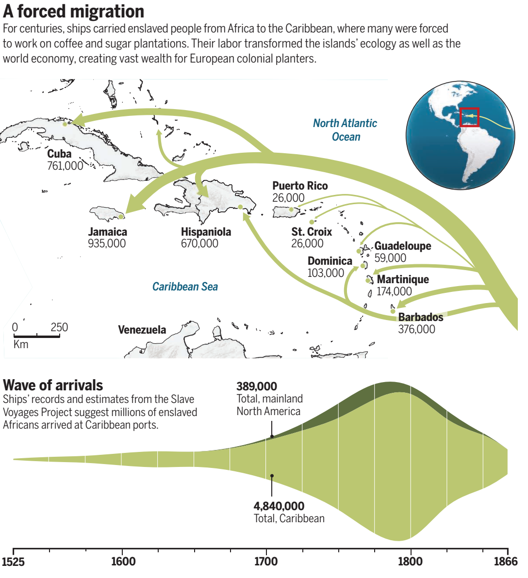 Di dân cưỡng bức diễn tra trong nhiều thế kỷ, những con tàu chở nô lệ từ châu Phi sang Caribbean, nơi họ bị ép buộc phải lao động trong các đồn điền cà phê và mía. Lao động của họ đã biến đổi hệ sinh thái các hòn đảo cũng như nền kinh tế thế giới, tạo ra khối tài sản khổng lồ cho các chủ đồn điền châu Âu.