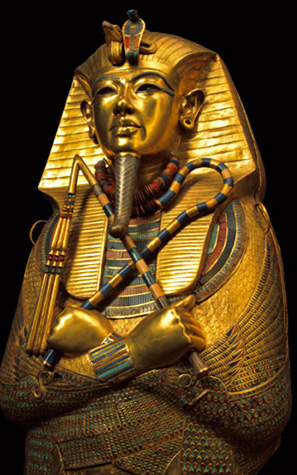 ![]() Biểu tượng của Ai Cập cổ đại, nhà vua trẻ sau khi chết được tái hiện bằng bức tượng làm từ vàng, thủy tinh và đá quí. Bức tượng này cũng như các đồ vật quí báu khác được tìm thấy trong mộ của ông giờ được trưng bày tại Bảo tàng Ai Cập ở Cairo, nơi thu hút rất đông khách tham quan. |