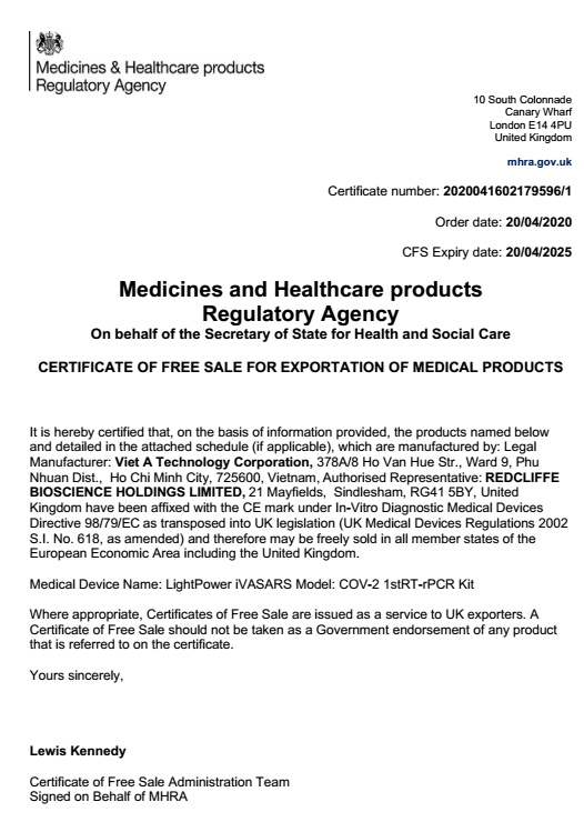 Ông Phan Quốc Việt, Tổng giám đốc công ty Việt Á cho biết, Bộ Y tế và Chăm sóc xã hội Anh đã cấp giấy chứng nhận đạt tiêu chuẩn châu Âu (CE) và cấp giấy chứng nhận lưu hành tự do (CFS) cho bộ sản phẩm xét nghiệm COVID-19 do Bộ KH&CN giao Học viện Quân y và Công ty Việt Á phối hợp nghiên cứu, sản xuất.