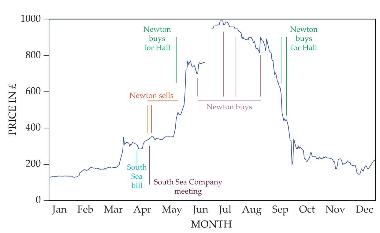 Chúng ta có thể theo dõi quyết định tài chính của ông trong biểu đồ theo dõi giá cổ phiếu Biển Nam với giá điều chỉnh cho cổ tức. Các đường ngang biểu thị phạm vi ngày gần đúng cho các giao dịch mua và bán, và các đường thẳng đứng đánh dấu ngày ghi lại các giao dịch thực tế hoặc hướng dẫn cho các giao dịch. Ghi chú “Newton mua cho Hall” thể hiện cho một số giao dịch mua chứng khoán Biển Đông của bất động sản Hall, trong đó Newton là giám đốc điều hành. Dòng hóa đơn Biển Nam được đánh dấu vào ngày 7/ 4, ngày luật cho phép thực hiện kế hoạch Biển Nam chính thức được thông qua và “cuộc họp của Công ty Biển Nam” biểu thị một cuộc họp của các nhà đầu tư vào ngày 21/4. Khoảng cách về giá vào cuối tháng sáu là do sự thay đổi từ các giao dịch thanh toán tiền mặt ngay lập tức mà ngày nay được gọi là “quyền chọn”.