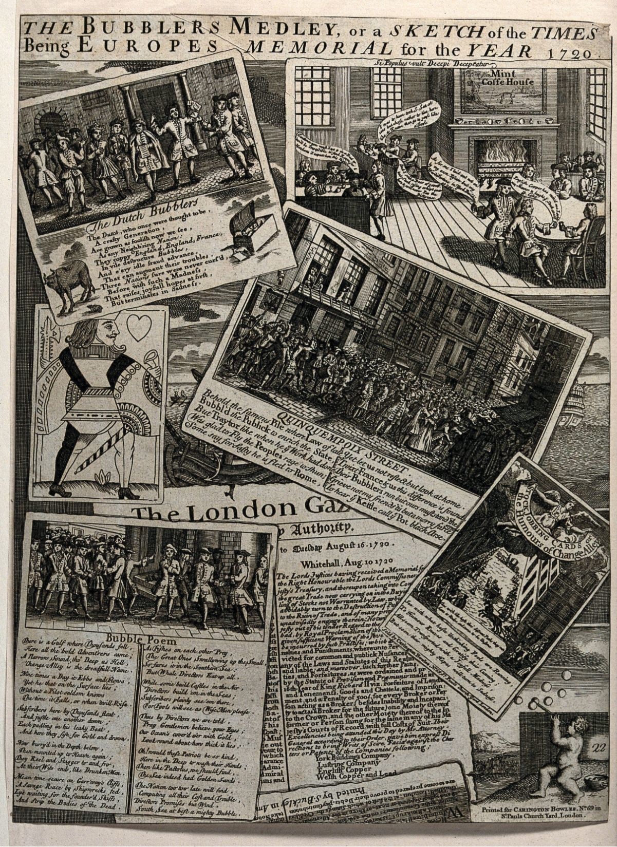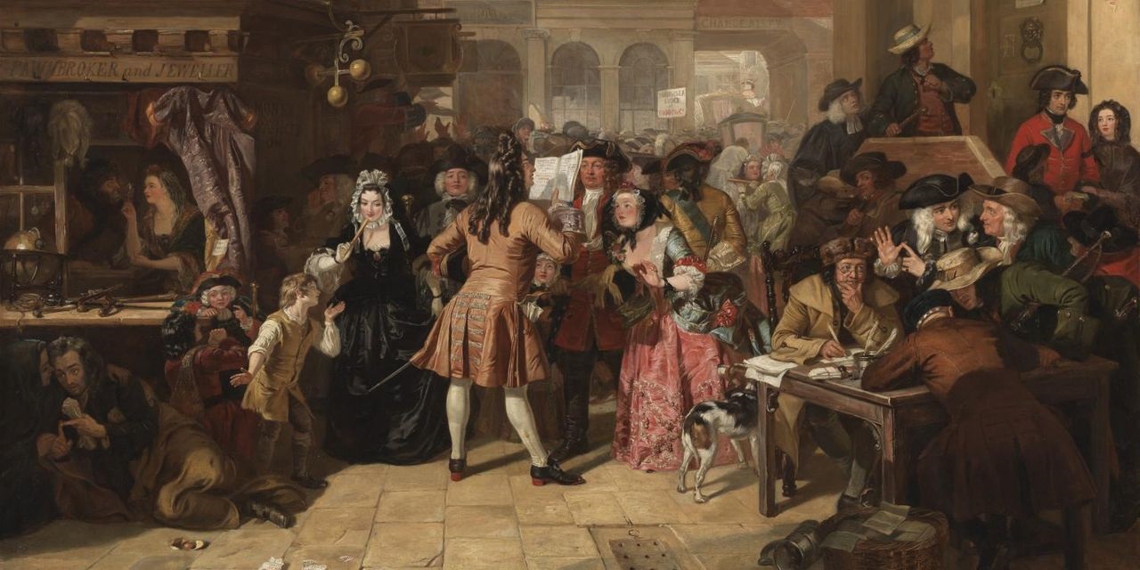 Một bản in châm biếm năm 1720 về sự hỗn loạn của bong bóng tài chính, bao gồm Bong bóng Biển Nam. (Hình ảnh từ Bộ sưu tập Wellcome, CC BY 4.0.)