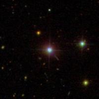 Hình 1a. Quasar 3C 273, Maarten Schmidt phát hiện vào năm 1963. Có thể thấy vệch sáng (jet) từ quasar trải về góc dưới bên phải. Các vạch phổ mà Schmidt đo từ 3C 273 bị lệch về đỏ quá lớn. “Đấy là một phát hiện kinh ngạc bởi vì sao không thể làm được thế,” Schmidt nói. Sông Ngân trải dài chừng 100,000 năm ánh sáng, trong khi 3C 273 ở cách 2 tỉ năm ánh sáng, không thể là sao trong Ngân Hà của chúng ta. Một vì sao đơn lẻ mà ở cách 2 tỉ năm ánh sáng sẽ lu mờ khó thấy được. Có nghĩa là nguồn ánh sáng của quasar phải cực kỳ mạnh mới xuất hiện được một cách “bình thường” như thế. (Ảnh của SSDS.)