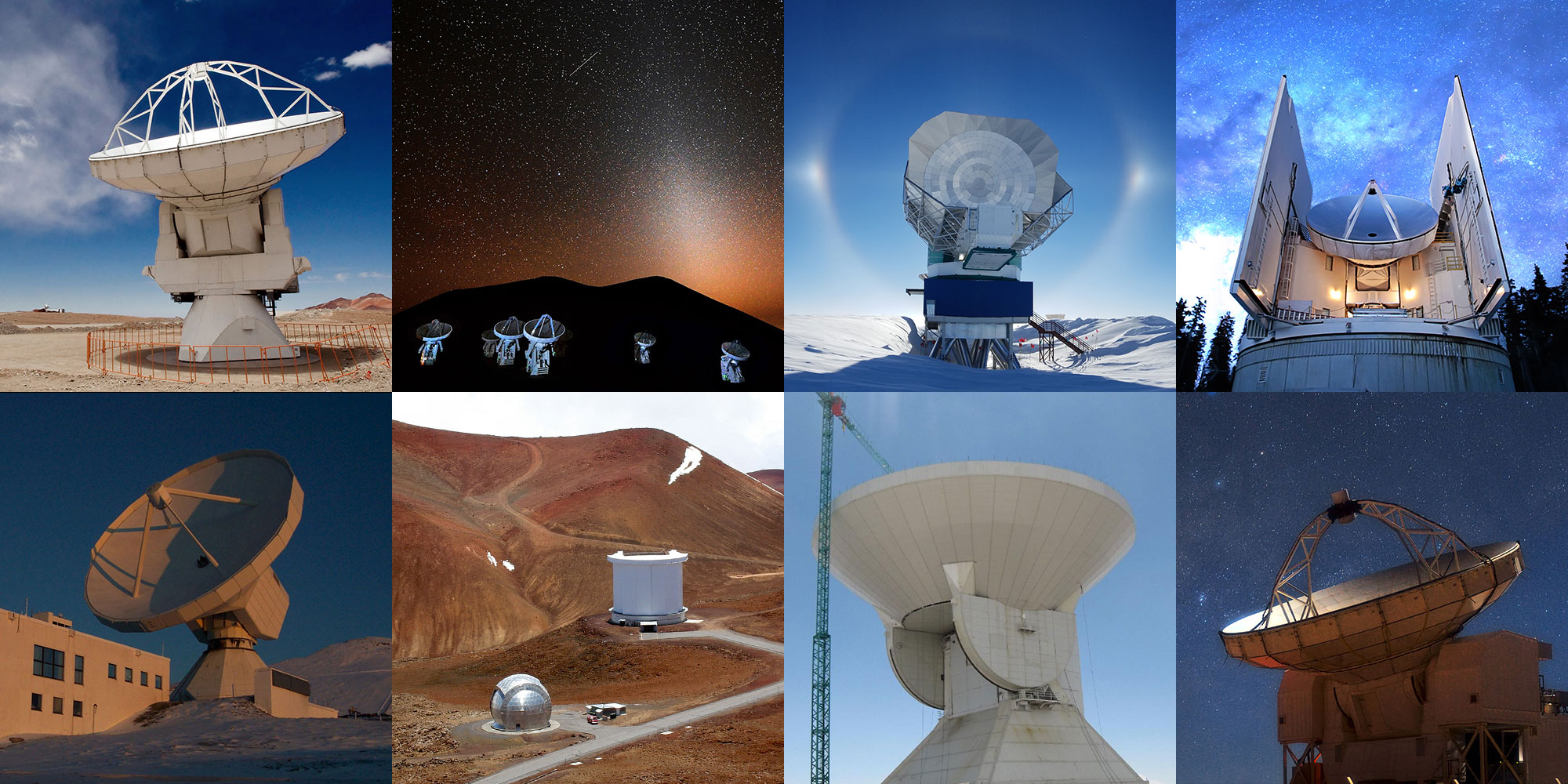 Hình 5b. Những đài thiên văn tham dự quan sát với Event Horizon Telescope (theo chiều kim đồng hồ từ phía trên bên trái) Atacama Large Millimeter/submillimeter Array (ALMA) ở Chile; SubMillimeter Array (SMA) in Hawaii; South Pole Telescope (SPT) ở châu Nam cực; Submillimeter Telescope (SMT) ở Arizona; Atacama Pathfinder Experiment (APEX) ở Chile; Large Millimeter Telescope (LMT) ở Mexico; James Clerk Maxwell Telescope (JCMT) ở Hawaii; và Institut de Radioastronomie Millimétrique (IRAM 30m) ở Tây Ban Nha.